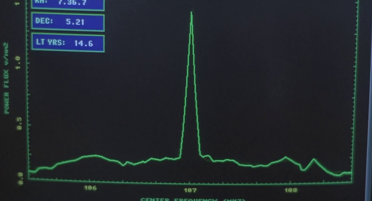 Zane (Charlie Sheen) i Calvin (Richard Schiff) prowadzą badania przy pomocy radioteleskopu. Calvin jest chyba przemęczony albo i znudzony, przysypia. Ich celem jest położona ponad 14 lat świetlnych od Ziemi gwiazda typu F, Wolf-336. To może być dobry cel. Zamiast operować w zakresie mikrofal, Zane postanowił zmienić częstotliwość. Podczas rozmowy ze swoją dziewczyną, Char (Teri Polo), tuż przed wyjściem do domu, słyszy z milczących dotychczas głośników, jakiś sygnał. Radioteleskop coś odebrał. Zane zapominając nawet odłożyć słuchawkę telefonu, wraz z kolegą rozpoczyna procedurę potwierdzenia sygnału. O ile u nich wszystko się zgadza, to tuż przed nawiązaniem kontaktu z inną stacją aby potwierdzić kontakt, sygnał z Wolfa-336 milknie.