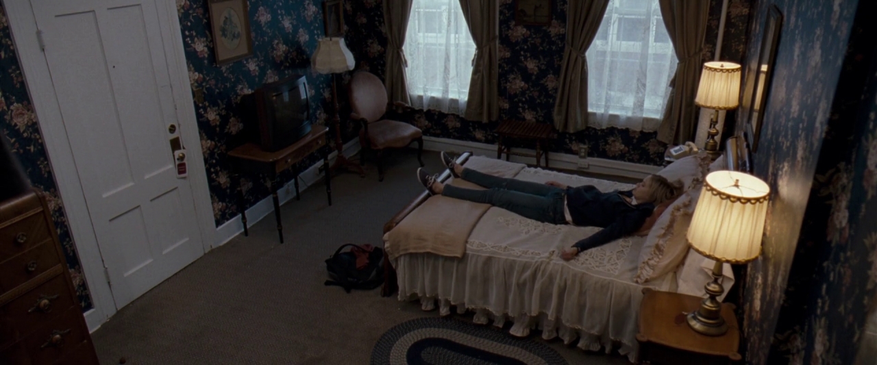 Claire zajmuje pokój 214, pracownicy przecież, nie będą na nogach przez cały weekend, siedmiogodzinne zmiany będą odpowiednie. Wchodząc do pokoju, na korytarzu, widzi kobietę (Alison Bartlett) z dzieckiem (Jake Ryan). Pokój jest czysty, zadbany, cały hotel też wydaje się być należycie utrzymany, nie ma brudnych ścian, zacieków na nich, uszkodzonych okien. Brudu też nie widać. Owszem, można dostrzec lekkie zużycie, szczególnie z zewnątrz.