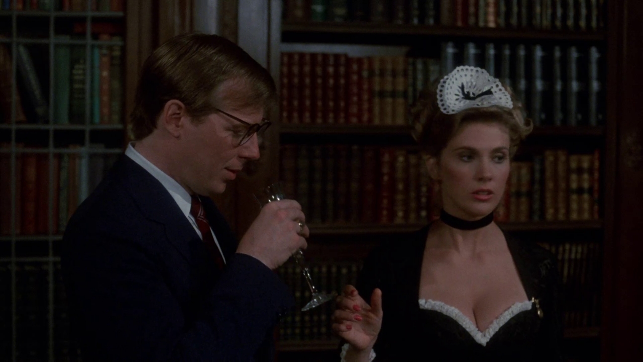 Gości jest sześciu, pani Peacock (Eileen Brennan), pani White (Madeline Kahn), panna Scarlet (Lesley Ann Warren), prof. Plum (Christopher Lloyd), pan Green (Michael McKean), płk. Mustard (Martin Mull). Wszyscy są elegancko ubrani, ale co ich łączy, jest zagadką nawet dla nich. Oprócz nich w posiadłości jest wspomniany wcześniej lokaj, pokojówka Yvette (Colleen Camp), kucharka Ho (Kellye Nakahara). Co ciekawe, wygląda, że gospodarza nie będzie. Pytanie, kim jest gospodarz Wadsworth ignoruje z lekkim uśmiechem. Ze zaproszeń wyglądało tak, jakby spóźniający się ostatni gość, pan Boddy (Lee Ving), miałby być ich gospodarzem, ale tak nie jest.