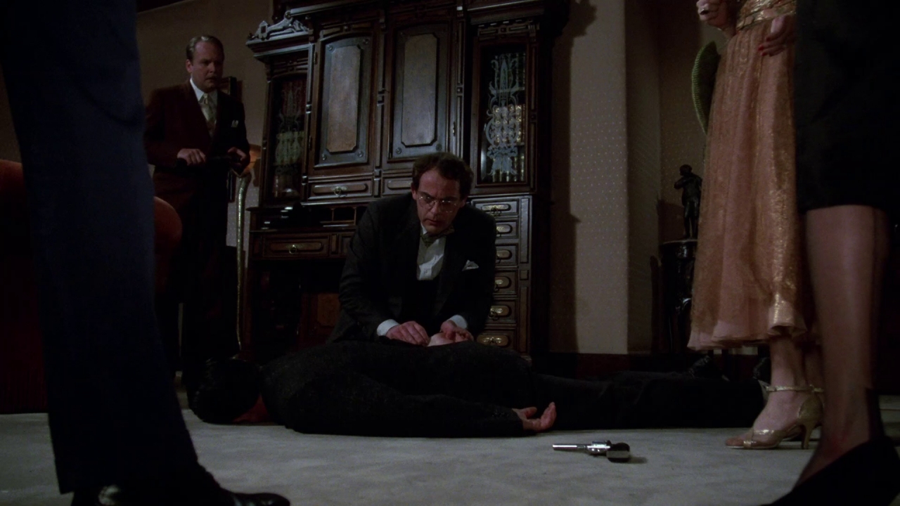 Jednak największym chyba zaskoczeniem jest to, że film to ekranizacja gry… planszowej. Podobno jest to pierwszy film, w którym taką zekranizowano. Gra w oryginale nazywa się „Clue”, bądź „Cluedo”. Ja w latach osiemdziesiątych grałem w wydaną w Polsce wersję pod nazwą „Detektyw”, kto wie, może nawet gdzieś leży w szafie. Imiona uczestników polski wydawca pozmieniał, ostał się tylko Musztarda. Narzędzia zbrodni i liczba uczestników jest taka sama. Stąd też, tak dziwny podtytuł recenzji – tak kończyło się śledztwo w grze, określając kto, czym i gdzie zabił.