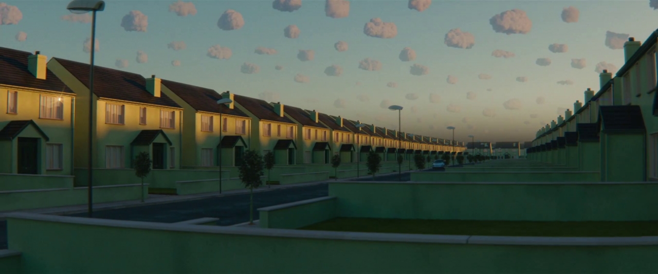 Twórcy tak stworzyli osiedle, że widać jego sztuczność, widać namalowane niebo, czy bardziej odległe domostwa. Sztuczność bije w oczy, ale tak właśnie ma być.